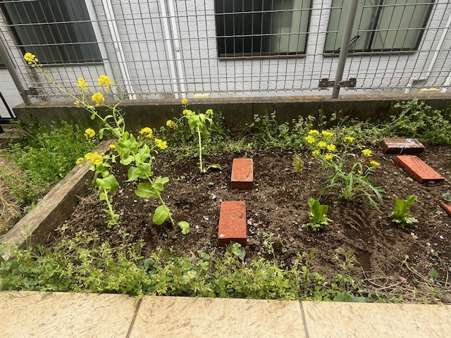 3月下旬。レタス、水菜の花が咲き始めのお写真。